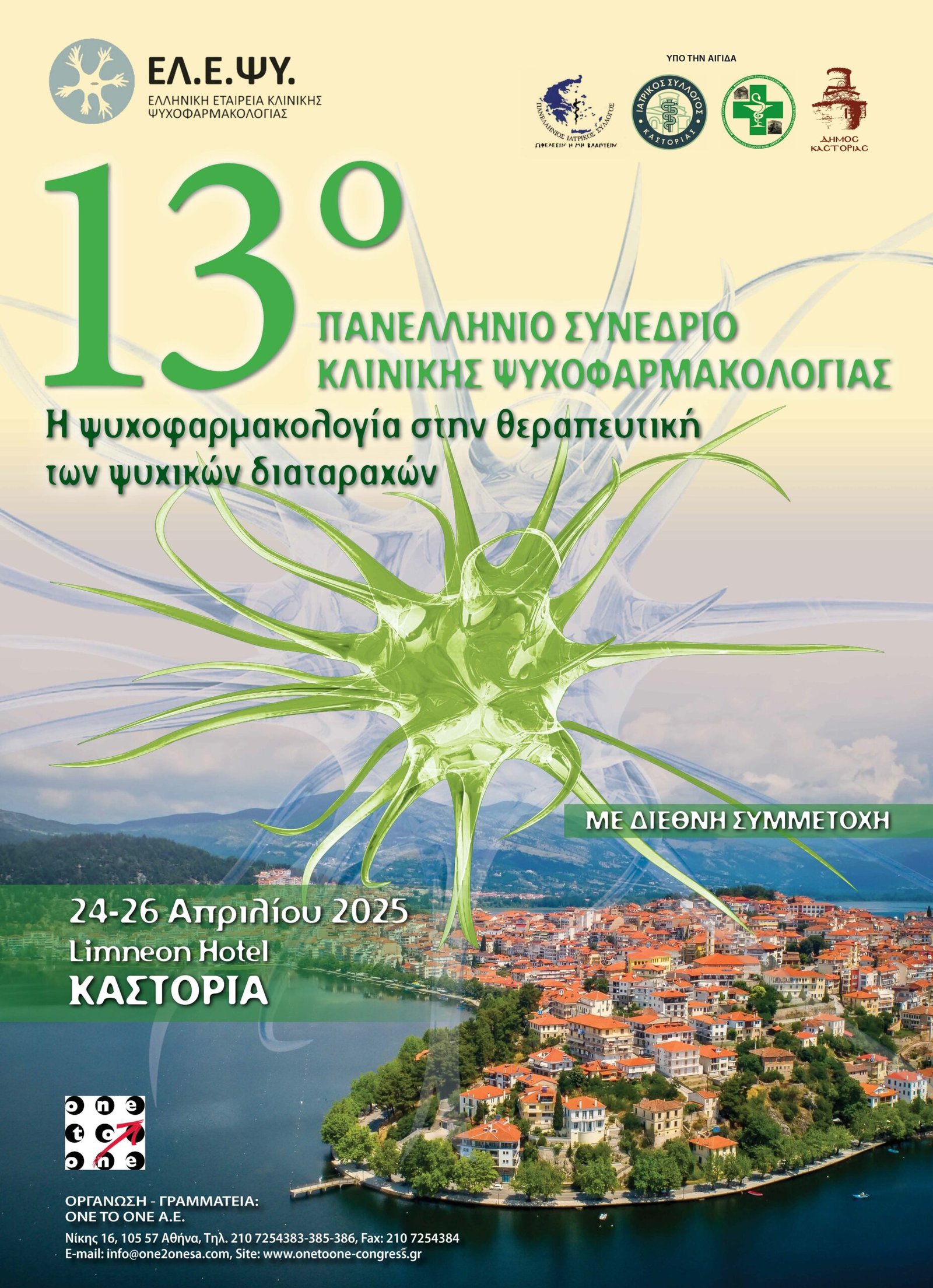 Η Ελληνική Εταιρεία Κλινικής Ψυχοφαρμακολογίας, (ΕΛ.Ε.ΨΥ) https://www.elepsy.gr/ θα πραγματοποιήσει το 13ο Πανελλήνιο Συνέδριο Κλινικής Ψυχοφαρμακολογίας από 24 έως 26 Απριλίου 2025 στην Καστοριά https://elepsy2025.gr.