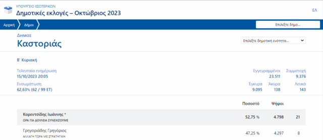 Συγκεντρωτικά Δήμου Καστοριάς στο 62,63%