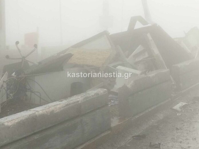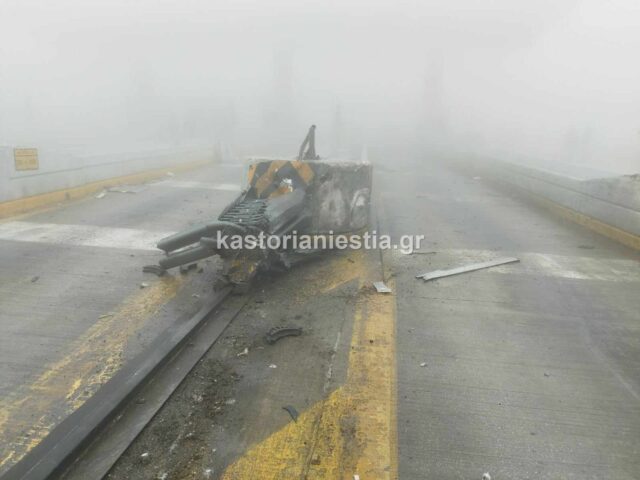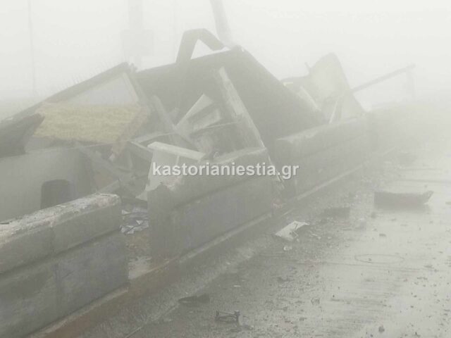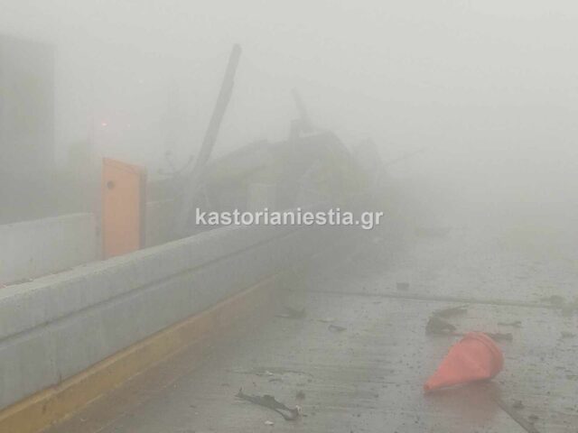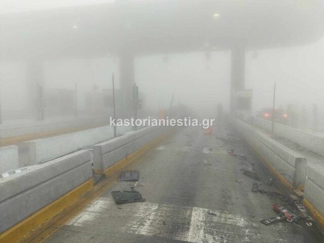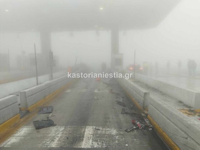 Σύμφωνα με νεότερες πληροφορίες του kastorianiestia.gr το σοβαρό ατύχημα που συνέβη πριν από μία ώρα περίπου οφείλεται στην πυκνή ομίλχη που επικρατεί στην περιοχή και στην ελλειπή φωτεινή σήμανση που είχαν τα διόδια με αποτέλεσμα ο οδηγός της νταλίκας, πιθανόν βυτιοφόρου να μην αντιληφθεί τα διόδια και να πέσει με ταχύτητα πάνω στα γκισέ.