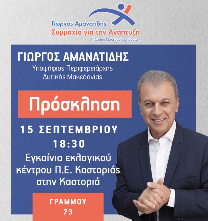 Σας προσκαλούμε στα εγκαίνια του εκλογικού κέντρου του συνδυασμού μας “Συμμαχία για την Ανάπτυξη” στην Π.Ε. Καστοριάς που θα πραγματοποιηθούν στην πόλη της Καστοριάς (Γράμμου 73) την Παρασκευή 15 Σεπτεμβρίου και ώρα 6:30μ.μ.