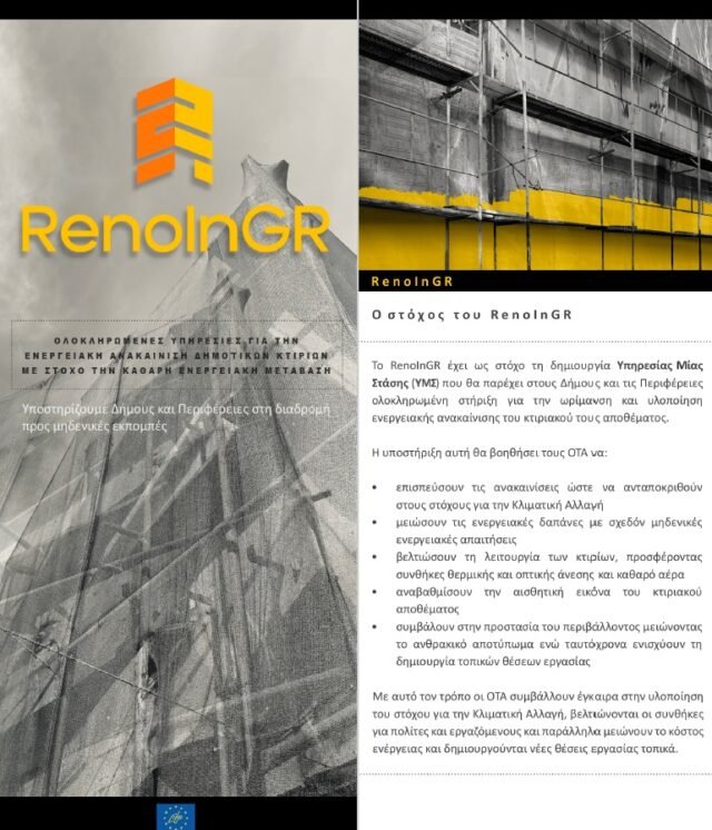 H Περιφέρεια Μακεδονίας συμμετέχει στο έργο RenoInGR στο πλαίσιο του Προγράμματος LIFE. Το έργο RenoInGR στοχεύει στην επιτάχυνση της ενεργειακής αναβάθμισης του δημόσιου κτιριακού αποθέματος στην Ελλάδα, μέσω της δημιουργίας μιας Υπηρεσίας μιας Στάσης (ΥμΣ), προσαρμοσμένης στις ανάγκες των Δήμων. Το έργο στοχεύει στην αντιμετώπιση της τεχνικής πολυπλοκότητας, των πιθανών ασαφειών και των χρηματοδοτικών κενών, που συχνά εμποδίζουν την ενεργειακή αναβάθμιση των δημόσιων κτιρίων.