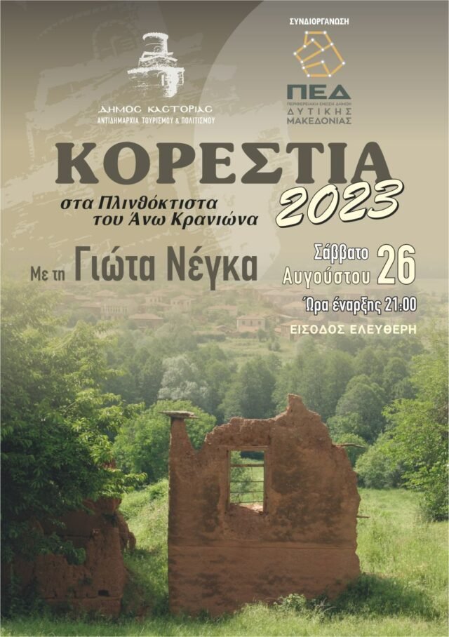 Με μια ξεχωριστή συναυλία συνεχίζεται το «Πολιτιστικό Καλοκαίρι 2023» του Δήμου Καστοριάς, το Σάββατο 26 Αυγούστου στα Πλινθόκτιστα του Άνω Κρανιώνα Κορεστείων και επί σκηνής τη μοναδική τραγουδοποιό Γιώτα Νέγκα.
