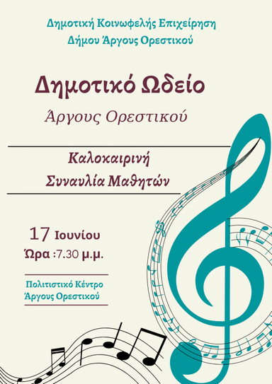 Η Δημοτική Κοινωφελής Επιχείρηση Δήμου Άργους Ορεστικού σας προσκαλεί στη καλοκαιρινή Συναυλία των σπουδαστών του Δημοτικού Ωδείου, την Παρασκευή 17 Ιουνίου και ώρα 7:30μ.μ στο Πολιτιστικό Κέντρο Άργους Ορεστικού.