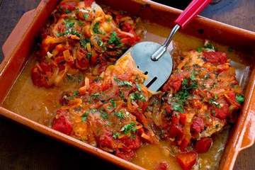 Αρχικά πλύντε και καθαρίστε τα ψάρια ή ζητήστε το από τον ψαρά σας. Χαράξτε τα με 2-3 χαρακιές σε κάθε πλευρά τους, αλατοπιπερώστε τα εσωτερικά και εξωτερικά και στρώστε τα σε ένα μεγάλο ταψί. Σε μια λεκάνη ανακατέψτε τις πατάτες, τα κρεμμύδια, το σκόρδο, την πιπεριά, τις ντομάτες, το χυμό και τον πελτέ. Ρίξτε τα κι αυτά στο ταψί και περιχύστε με το λάδι. Ψήστε σε καλά προθερμασμένο φούρνο, σε μέτρια θερμοκρασία μέχρι να γίνουν οι πατάτες, προσέχοντας αν χρειαστεί να προσθέσουμε λίγο νεράκι.