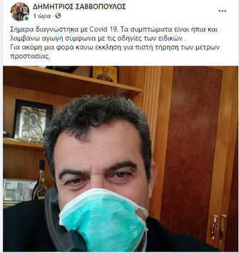 Σήμερα διαγνώστηκα με Covid 19. Τα συμπτώματα είναι ήπια και λαμβάνω αγωγή σύμφωνα με τις οδηγίες των ειδικών .