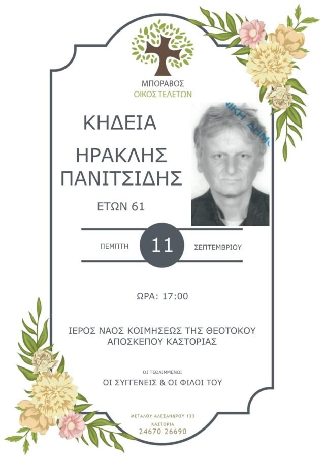 ΕλλάδαΚοινωνία Θλίψη στην Καστοριά από τον θάνατο 61χρονου 11 Σεπτεμβρίου 2025 FacebookTwitterPinterestWhatsApp Funeral symbol. Mood and Condolence card concept. Έφυγε από την ζωή σε ηλικία 61 ετών ο Ηρακλής Πανιστσίδης από τον Απόσκεπο. Η κηδεία του θα γίνει σήμερα Πέμπτη το απόγευμα στις 5 από τον Ιερό Ναό Κοιμήσεως της Θεοτόκου Αποσκέπου Κοινοποιήστε: Mοιραστείτε στο Facebook(Ανοίγει σε νέο παράθυρο) Facebook Share on X(Ανοίγει σε νέο παράθυρο) X