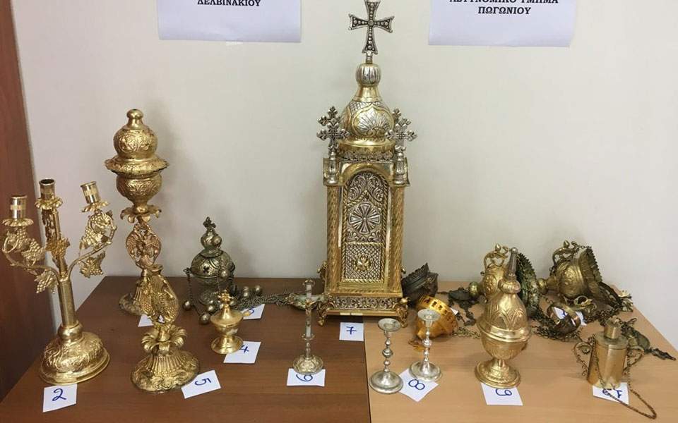 Ειδικότερα, μετά από πληροφορίες η αστυνομία εντόπισε σε κρύπτη μέσα σε δύσβατη περιοχή στη γραμμή των συνόρων με την Αλβανία δύο σακίδια μέσα στα οποία βρίσκονταν, ένα καντήλι Αγίας Τράπεζας με βάση, τρικέρι και δύο μυροδοχεία, θυμιατό και λιβανιστήρι, σταυρός αγιασμού, ιερό αρτοφόριο Αγίας Τράπεζας, δύο κηροπήγια και τέσσερις καντήλες.