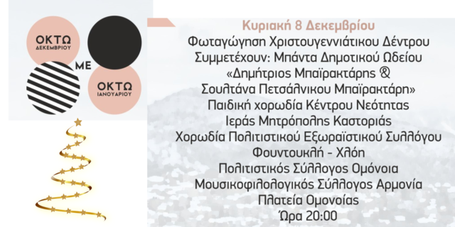 Το πλούσιο εορταστικό πρόγραμμα «8 με 8» του Δήμου Καστοριάς θα διαρκέσει έναν ολόκληρο μήνα. Μπορείτε να δείτε το αναλυτικό πρόγραμμα εδώ: https://kastoria.gov.gr/eortastiko-programma-8-me-8-tou-dimou-kastorias-8-dekemvriou-2024-8-ianouariou-2025/