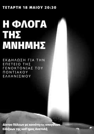 - Στις 20:30 άναμμα της φλόγας σε μικρά φαναράκια και έναρξη πορείας προς το Μνημείο Ποντιακού Ελληνισμού