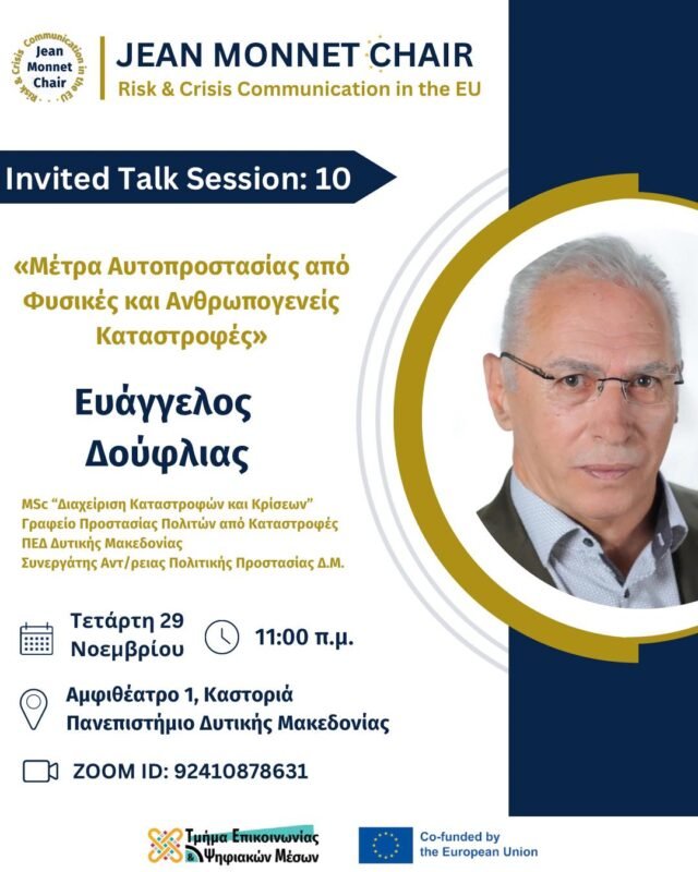 Η Έδρα Jean Monnet στην Επικοινωνιακή Διαχείριση Κρίσεων και Κινδύνου σας προσκαλεί στο 10ο Invited Talk Session, την Τετάρτη 29 Νοεμβρίου 2023 και ώρα 11:00 π.μ., στο Αμφιθέατρο 1, του Πανεπιστημίου Δυτικής Μακεδονίας στην Καστοριά, με καλεσμένο ομιλητή τον κ. Ευάγγελο Δούφλια σε μια διάλεξη δια ζώσης αλλά και διαδικτυακά με θέμα: «Μέτρα Αυτοπροστασίας από Φυσικούς και Ανθρωπογενείς Παράγοντες». Τη διάλεξη θα συντονίζει η Αμαλία Τριανταφυλλίδου, καθηγήτρια του τμήματος Επικοινωνίας και Ψηφιακών Μέσων, του Πανεπιστημίου Δυτικής Μακεδονίας. Θα δοθούν βεβαιώσεις παρακολούθησης. Η διάλεξη θα πραγματοποιηθεί μέσω της πλατφόρμας ZOOM:• Meeting ID – 92410878631• https://zoom.us/j/92410878631 Ο Ευάγγελος Δούφλιας υπηρετεί την τοπική αυτοδιοίκηση από το1993 σαν υπάλληλος της π. ΤΕΔΚ Ν. Καστοριάς και της Περιφερειακής Ένωσης Δήμων Δυτικής Μακεδονίας – Γραφείο Προστασίας Πολιτών από Καταστροφές και την τελευταία διετία είναι και συνεργάτης της νεοσύστατης Αντιπεριφέρειας Πολιτικής Προστασίας Δυτικής Μακεδονίας. Διαθέτει μεταπτυχιακό δίπλωμα με ειδίκευση στις Στρατηγικές Διαχείρισης Καταστροφών και Κρίσεων. Έχει συμμετάσχει με δημοσιεύσεις και ανακοινώσεις σε Διεθνή Συνέδρια Πολιτικής Προστασίας (Safe Greece- Corfu, Safe Greece-Kozani,Safe Greece-Athens και σε Διεθνείς Ασκήσεις Πολιτικής Προστασίας. Διαθέτει πλήθος εκπαιδεύσεων από το Εθνικό Κέντρο Δημόσιας Διοίκησης & Aυτοδιοίκησης (ΕΚΔΑΑ) σε θέματα Πολιτικής Προστασίας και Διοίκησης καθώς και από το Ινστιτούτο Διαχείρισης Φυσικών και Ανθρωπογενών Καταστροφών (ΙΔΑΦΚ). Επιπλέον έχει συμμετάσχει σε Ευρωπαϊκά Προγράμματα για την Πολιτική Προστασία όπως INTERREG-IPA CBC Greece-Albania, 4PLUS, BALANCE και SOLVE.