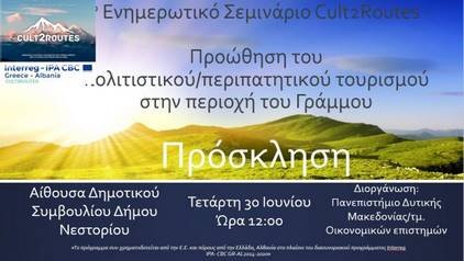 Το Πανεπιστήμιο Δυτικής Μακεδονίας, τμήμα Οικονομικών Επιστημών, διοργανώνει την Τετάρτη 30 Ιουνίου στις 12:00, στην αίθουσα Δημοτικού Συμβουλίου Δήμου Νεστορίου ενημερωτικό σεμινάριο με θέμα «Προώθηση του περιπατητικού /πολιτιστικού τουρισμού στην περιοχή του Γράμμου».
