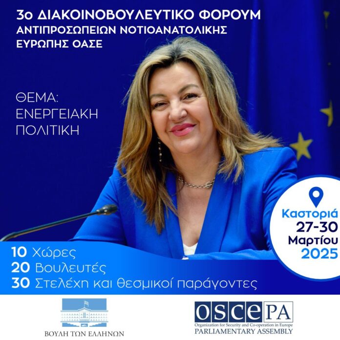 Με το εξαιρετικά ενδιαφέρον και επίκαιρο θέμα “ΕΝΕΡΓΕΙΑΚΗ ΠΟΛΙΤΙΚΗ” θα διεξαχθεί στην Καστοριά, 27-30 Μαρτίου 2025, το 3ο Διακοινοβουλευτικό Φόρουμ των Αντιπροσωπειών της Νοτιανατολικής Ευρώπης στην Κοινοβουλευτική Συνέλευση του Οργανισμού για την Ασφάλεια και τη Συνεργασία στην Ευρώπη (ΟΑΣΕ), με τη συμμετοχή Βουλευτών, Γραμματειών Αντιπροσωπειών της Κ.Σ. του ΟΑΣΕ, Στελεχών της Βουλής των Ελλήνων και άλλων πολιτικών και θεσμικών παραγόντων από δέκα χώρες.
