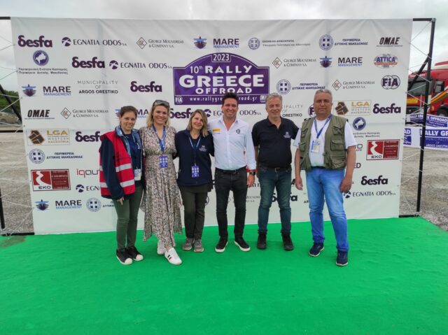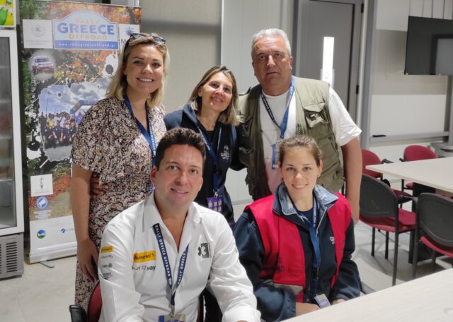 Από αριστερά η υπεύθυνη σχέσεων με τους αγωνιζομένους, Κατερίνα Μπράτσου, η συνεργάτης του κ. Taylor, Macita Hardacre, η υπεύθυνη Δημοσίων Σχέσεων του Rally Greece Offroad, Χριστίνα Στρίκκα, ο Chief Championship Officer του Extreme E, James Taylor, ο διευθυντής του Rally Greece Offroad, Κώστας Θεολόγης και το μέλος του διοικητικού συμβουλίου της «Εγνατία Οδός», Αντώνης Πασχάλης