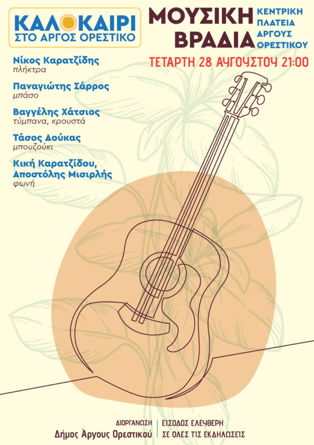 Την Τετάρτη 28 Αυγούστου στις 21:00 θα απολαύσουμε σε μια όμορφη μουσική βραδιά στην κεντρική πλατεία του Άργους Ορεστικού τον Τάσο Δούκα και την ομάδα του, τον Νίκο Καρατζίδη στα πλήκτρα, τον Παναγιώτη Σάρρο στο μπάσο, τον Βαγγέλη Χάτσιο στα τύμπανα και τα κρουστά και τους Κική Καρατζίδου και Αποστόλη Μισιρλή στη φωνή.