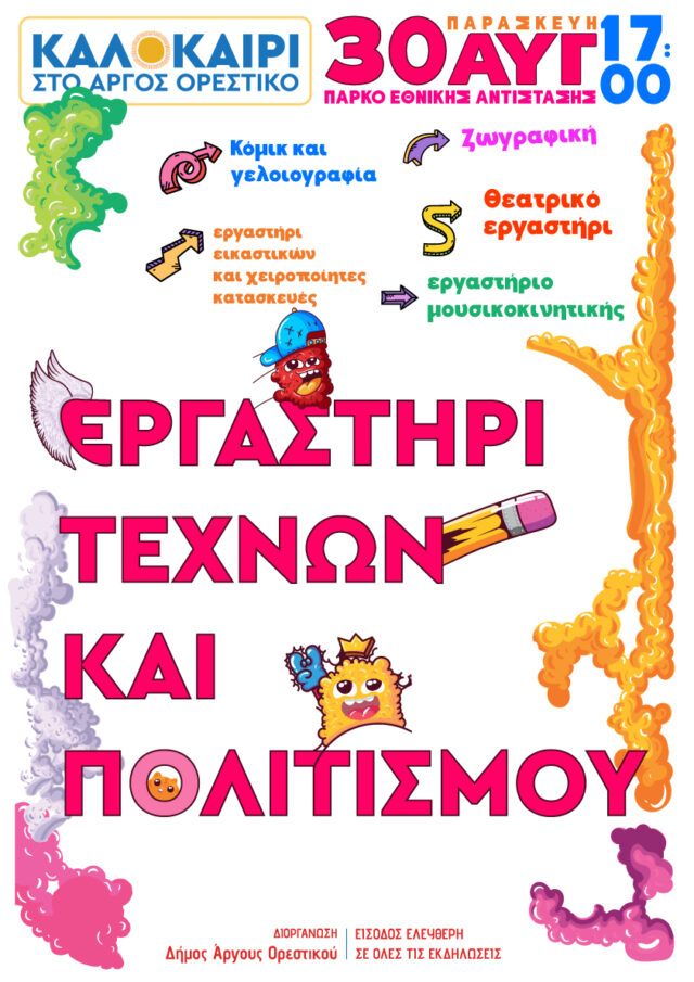Δύο μέρες αργότερα, την Παρασκευή 30 Αυγούστου στις 17:00 οι καλοκαιρινές εκδηλώσεις του Δήμου Άργους Ορεστικού ρίχνουν αυλαία με μια ιδιαίτερη δράση για όλα τα παιδιά. Το Εργαστήρι Τεχνών και Πολιτισμού έρχεται στο Πάρκο Εθνικής Αντίστασης για να χαρίσει μοναδικές στιγμές μέσα από πέντε εργαστήρια και επτά projects: θεατρικό εργαστήρι, εργαστήριο μουσικοκινητικής, εργαστήριο ζωγραφικής, εργαστήριο εικαστικών και DIY και εργαστήριο κόμικ και γελοιογραφίας, αναμένεται να συναρπάσουν τα παιδιά.