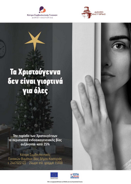 - Δράση ευαισθητοποίησης και πληροφόρησης σε συνεργασία με τον Εμπορικό Σύλλογο Καστοριάς. Διανεμήθηκαν και τοποθετήθηκαν αφίσες του Κέντρου Συμβουλευτικής Γυναικών του δήμου Καστοριάς στα εμπορικά καταστήματα της πόλης. Οι αφίσες περιλαμβάνουν μηνύματα που αφορούν στη βία των γυναικών, την αύξηση των περιστατικών ενδοοικογενειακής βίας κατά την περίοδο των εορτών και πληροφορίες για το Συμβουλευτικό Κέντρο. Ευχαριστούμε θερμά τον Εμπορικό Σύλλογο Καστοριάς για την άμεση ανταπόκριση και συνεργασία.