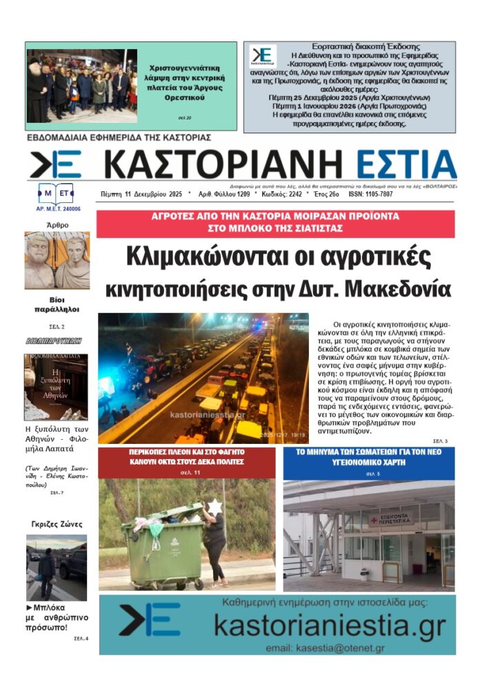 Το πρωτοσέλιδο της Καστοριανής Εστίας 11-12-2025