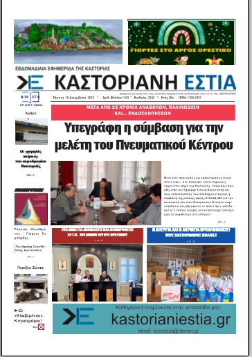 Το πρωτοσέλιδο της Καστοριανής Εστίας 19-12-2024