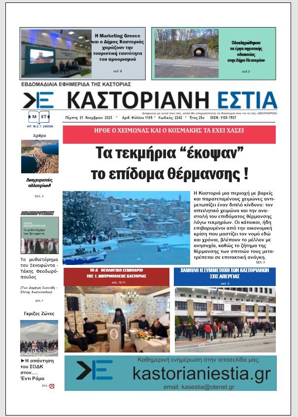 Το πρωτοσέλιδο της Καστοριανής Εστίας 21-11-2024