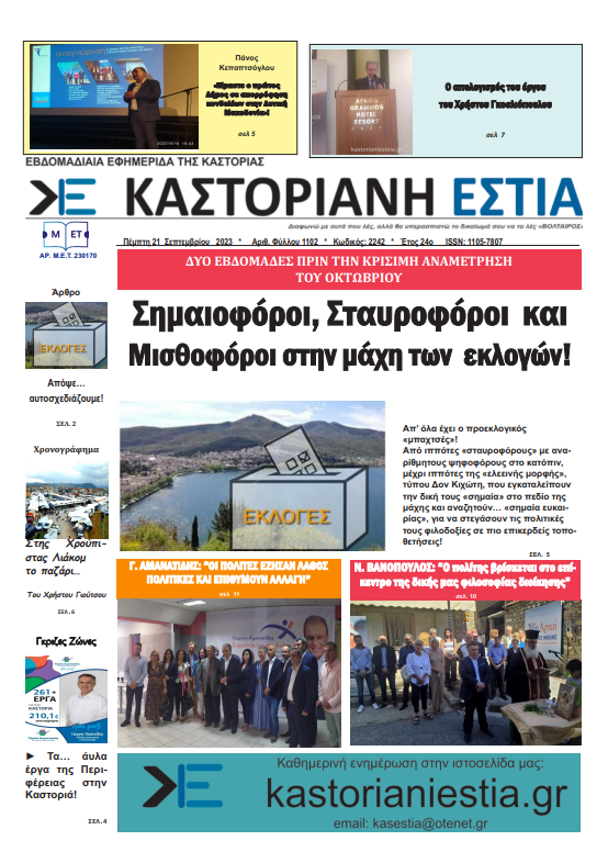 Το πρωτοσέλιδο της Καστοριανής Εστίας 21-9-2023