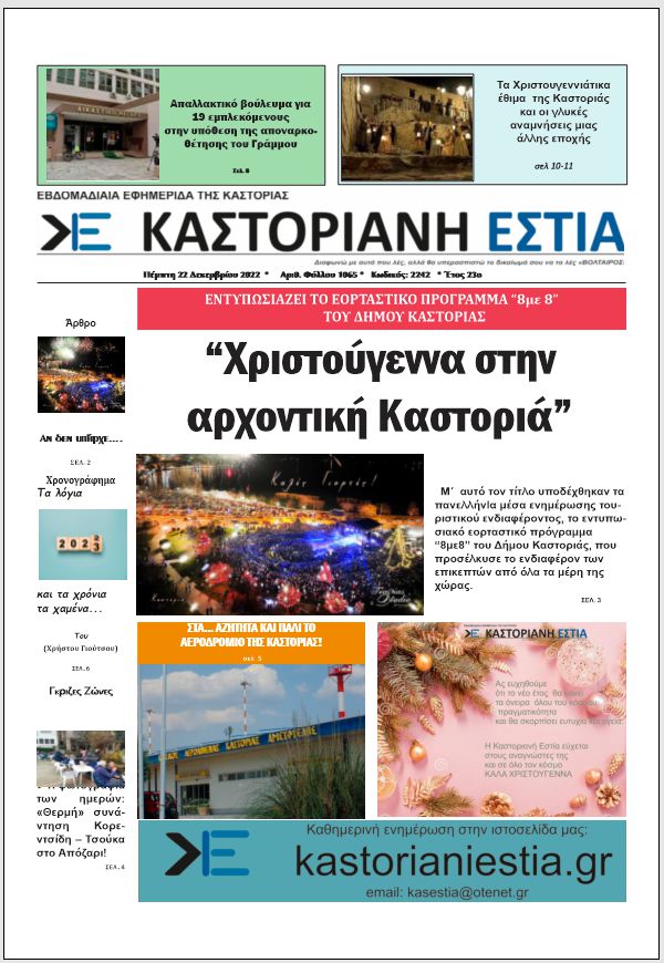 To πρωτοσέλιδο της Καστοριανής Εστίας 22-12-2022