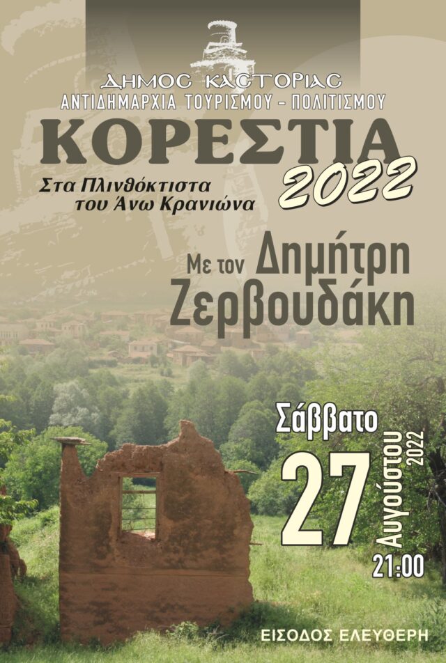 Το καλοκαίρι μας αποχαιρετά με μία μοναδική συναυλία με τον Δημήτρη Ζερβουδάκη που θα μας συντροφεύσει με γνωστά και αγαπημένα τραγούδια του στον ειδυλλιακό χώρο του Άνω Κρανιώνα!