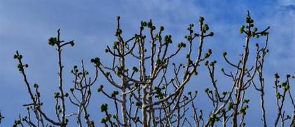 Οι συκιές δεν έχουν φύλλα, καθώς τα δέντρα είναι φυλλοβόλα και μάλιστα τα εν λόγω δέντρα δεν αντέχουν τις σχετικά χαμηλές θερμοκρασίες του χειμώνα.