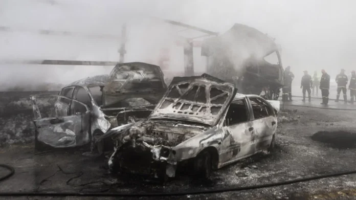 Όπως φαίνεται στο βίντεο, στην περιοχή των διοδίων, ακριβώς στις τέσσερις το απόγευμα της Μ. Τρίτης, 15 Απριλίου, επικρατεί πυκνή ομίχλη. Ενα αυτοκίνητο επιχειρεί να περάσει από τη λωρίδα του τηλεδιοδίου με χαμηλή ταχύτητα. Για κάποιο λόγο, η μπάρα δεν έχει ανοίξει και το αυτοκίνητο κάνει όπισθεν. Ξαφνικά, από το «πουθενά» εμφανίζεται η νταλίκα. Ο οδηγός της δεν έχει κόψει στο ελάχιστο ταχύτητα. Πέφτει πάνω στο αυτοκίνητο και σχεδόν ταυτόχρονα «γκρεμίζει» το κουβούκλιο, ενώ ένα δεύτερο αυτοκίνητο περνά εκείνη ακριβώς τη στιγμή από τη λωρίδα στην οποία φαίνεται ότι κατέληξε το box. Σχεδόν ταυτόχρονα ξέσπασε φωτιά. Τόσο το αυτοκίνητο του ζευγαριού των ομογενών, όσο και η νταλίκα τυλίγονται στις φλόγες. Οι δύο άνθρωποι δεν προλαβαίνουν να βγουν από το αυτοκίνητο και απανθρακώνονται. Αλλοι πέντε άνθρωποι τραυματίζονται, ευτυχώς χωρίς να απειλείται η ζωή τους.