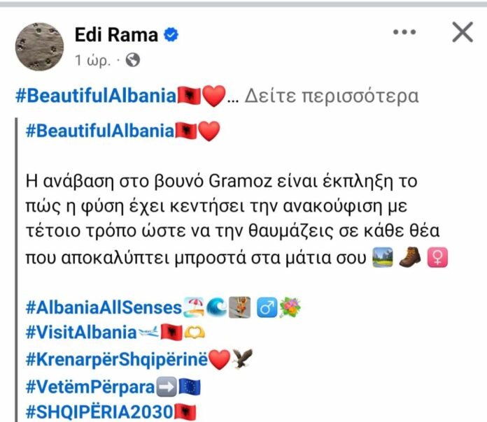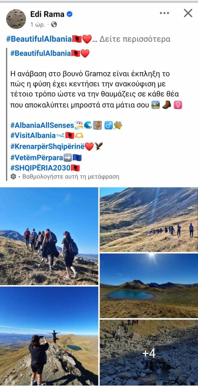 Με ανάρτησή του στο προσωπικό του προφίλ, ο Αλβανός Πρωθυπουργός Έντι Ράμα, επιχειρεί για δεύτερη φορά να οικειοποιηθεί την αλπική λίμνη Γκιστόβα του Γράμμου ως αξιοθέατο της Αλβανικής επικράτειας.